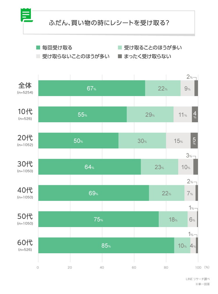 【LINEリサーチ】買い物の時にレシートを受け取る人は全体で7割弱、60代では8割以上 受け取ったレシートは「内容を確認したら、捨てる」と回答した人が4割弱という結果に (Commerce Pick)https://www.commercepick.com/archives/35253