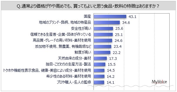 【プレミアム食品・飲料に関する調査】通常より価格がやや高めでも買ってもよいと思う食品・飲料の特徴は「国産」「地域のブランド・銘柄、地域の特産品」「安全性が高い」など (Commerce Pick)https://www.commercepick.com/archives/35216