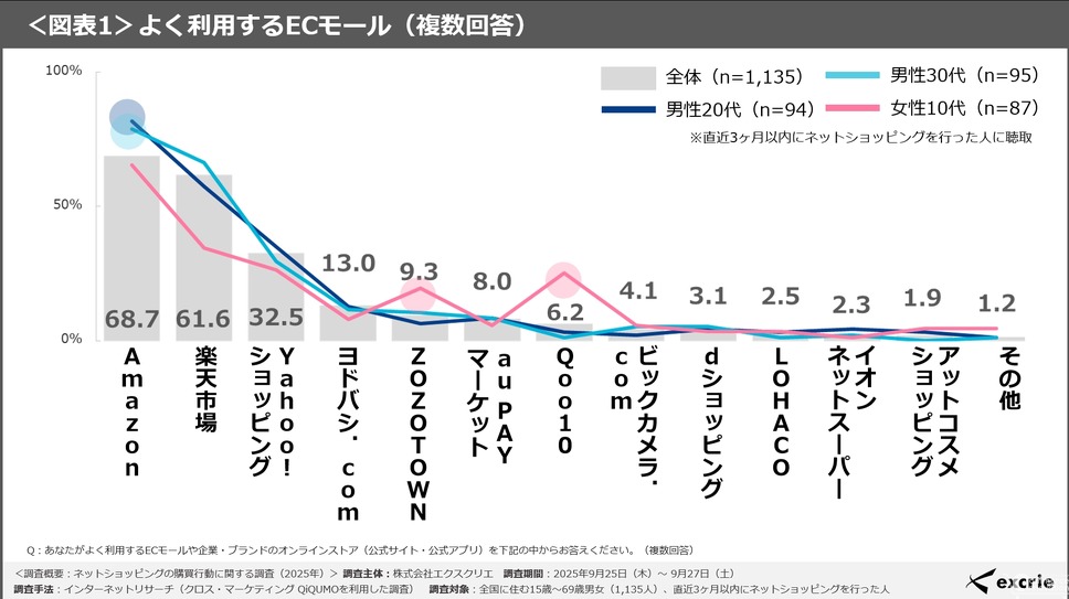 調査は2025年9月25日から27日にかけて、全国の15歳から69歳の男女1,135人を対象に実施されました。直近3ヶ月以内にネットショッピングを行った人に、よく利用するECモールについて聞いたところ、Amazonが圧倒的な支持を集めました。