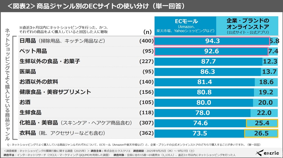 商品ジャンル別のECサイト使い分けでは、どの商品ジャンルにおいてもECモールでの購入が多数を占めました。特に日用品やペット用品では、ECモールでの購入率が9割を超えています。一方、衣料品と化粧品・美容品では、企業・ブランドのオンラインストアでの購入率が他の商品ジャンルに比べて高い傾向が見られました。
